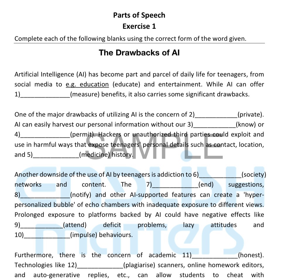 “These exercises are great as they expose me to different life-related topics while I practise using the correct form of words. Excellent practice for the blank-filling part in the HKDSE reading paper! “